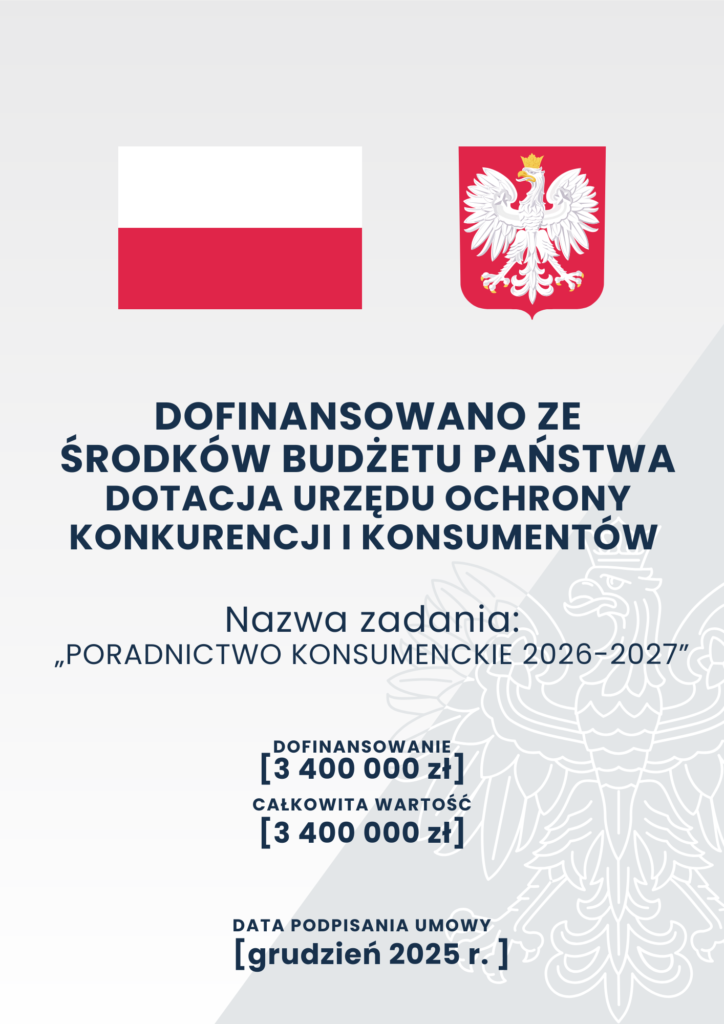 Projekt „Poradnictwo konsumenckie 2026–2027” stanowi element publicznej polityki ochrony praw konsumentów i jest realizowany w oparciu o środki finansowe przyznane przez UOKiK.
